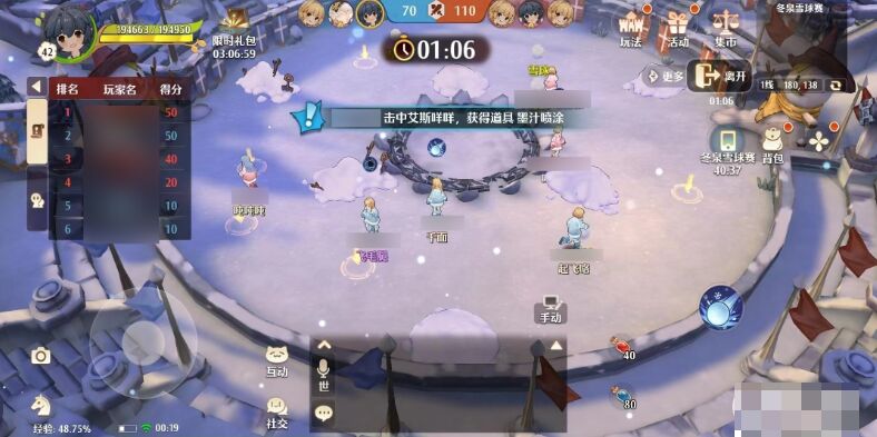 游戏的规则是3人为一队,经过搜集雪球向对方抛掷来核算得分,得分高的部队取得胜利。在游戏的过程中记住收取道具,在场地中心会不守时投进雪人,将雪球砸向它会具有道具,道具运用妥当会得到30分的奖赏,游戏时刻为150秒。每位玩家每天有2次的奖赏机遇和1次首胜奖赏。