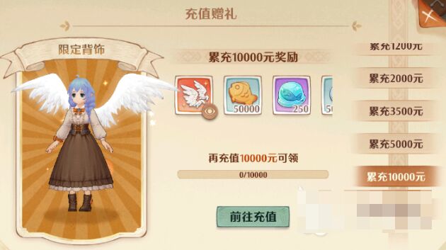 玩家们能够在活动页面找到特惠玩法,榜首栏中的【充值返利】中就能够看到充值界面了,界面右下方有一个充值赠礼,玩家们能够经过页面进行检查,最初始的阶层是从50元起充的,玩家们能够取得猫灵抽奖券,一起还有一些比较根底的猫灵晋级资源。而玩家们最关怀的【荣光之翼】获取的要求是需求玩家们充值金额累计到达1万元才能够取得的。