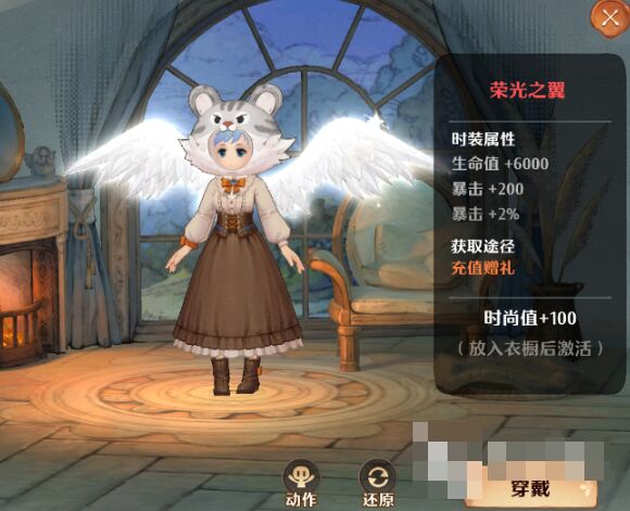 这款游戏中的【荣光之翼】其实是一个背饰,并且这个背饰是一个极端稀有的时装,玩家们在解锁这件时装后,能够激活时装专属的加成,会给人物添加六千的生命值,一起取得两百暴击,和2%的暴击率,现在这个背饰的加成是最高的,当然获取的条件其实也是比较严苛的。
