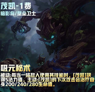茂凯技能就是吸元秘术被动技能主要就是在对敌人使其技能的时候会获得上额外的法力值,主动技能就是在治疗的时候给自身提升上一定数值的生命值还是相当的不错。