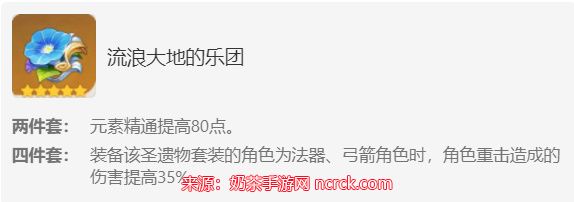 3、两魔女两乐团:虽然其都是两件套,也只能做为过渡使用,但优点有两个,一是2+2的圣遗物好弄,二是面板和圣遗物词条也较为好凑,这两个优点对于过渡圣遗物搭配来说已经是相当不错了。