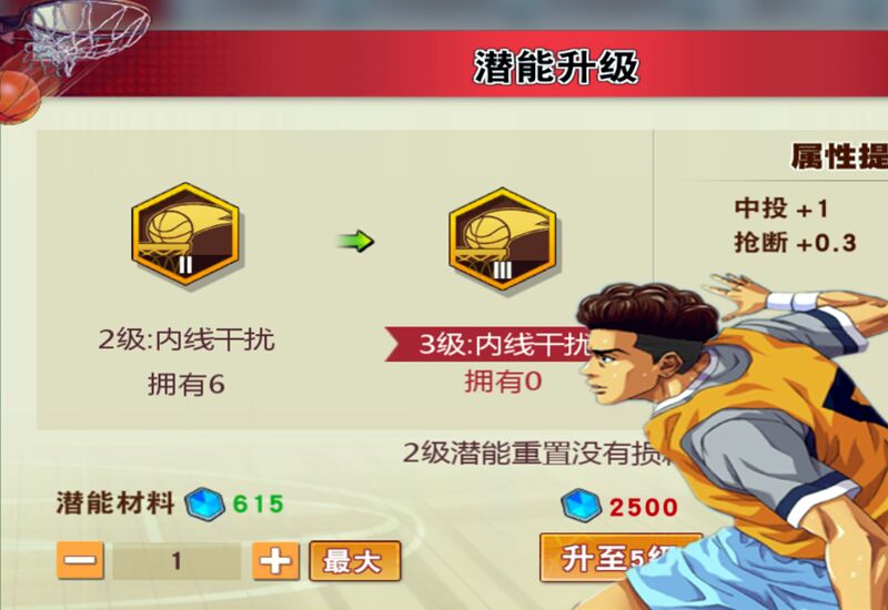 【内线干扰】提供的是中投、抢断和空位中投,正常的比赛中,想要上篮的风险太大,面对一些玩得比较好的中锋,会被盖得满头包,所以可以考虑一手中投,而且这里也有抢断,比较适合宫城,所以推荐的是【内线干扰】。