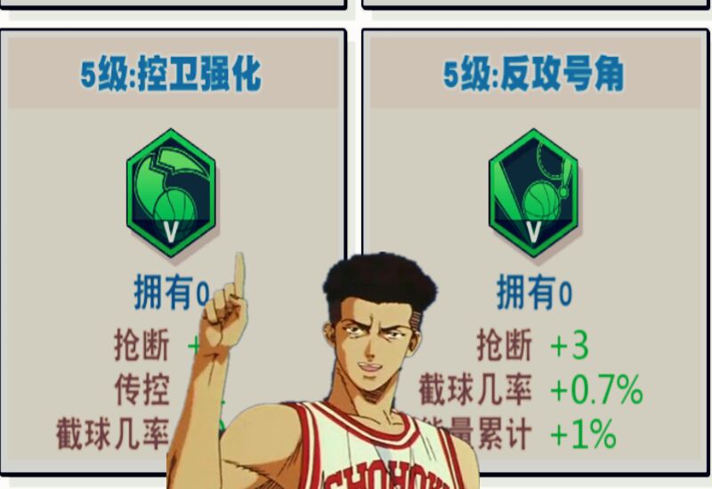 这里有两个可选,【反攻号角】有抢断和截球以及额外的能量,【控卫强化】则是有抢断、传控和截球。
