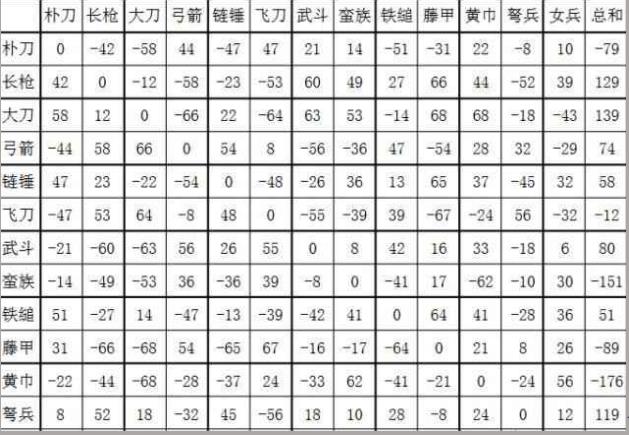平克凹、凹克尖、尖克平具体看图(在第一列找到敌方兵种,在本行查找负数即为我方可知敌人,负数绝对值越大克制越强):